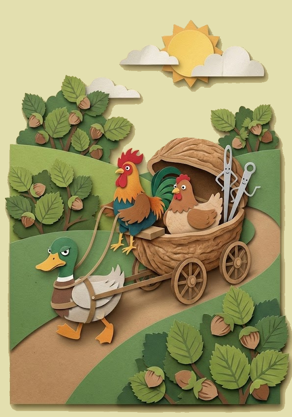 Da gingen sie zusammen fort auf den Berg. Weil es ein heller Tag war, blieben sie bis zum Abend. Nun weiß ich nicht, ob sie sich so dick gegessen hatten oder ob sie übermütig geworden waren. Kurz, sie wollten nicht zu Fuß nach Hause gehen, und das Hähnchen musste einen kleinen Wagen aus Nussschalen bauen.