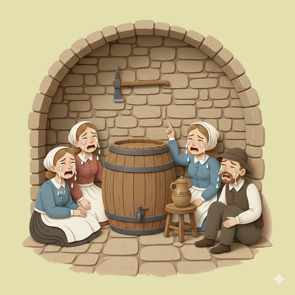 Als er aber in den Keller kam und alle da beieinander saßen und weinten, und er die Ursache hörte, dass das Kind der Else schuld wäre, das sie vielleicht einmal zur Welt brächte, und von der Kreuzhacke könnte totgeschlagen werden, wenn es gerade zur Zeit, wo sie herabfiele, darunter säße, um Bier zu zapfen, da rief er: