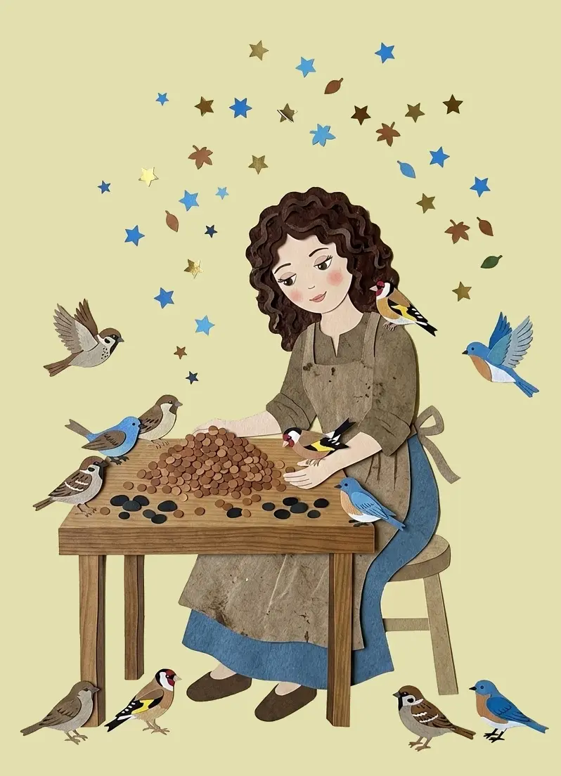 Aschenputtel setzte sich betrübt auf den Herd und schüttete die Wicken aus. Da flogen die Tauben wieder herein und fragten freundlich: