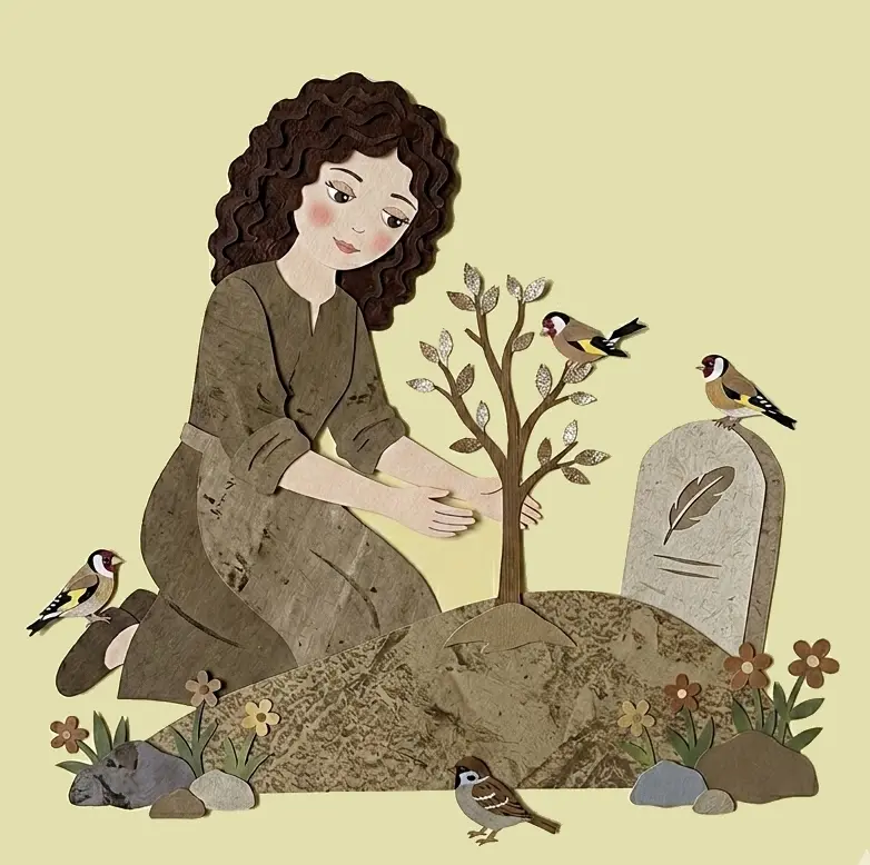 Das Mädchen weinte sehr und pflanzte, wie die Mutter es ihr gesagt hatte, ein kleines Bäumchen auf ihr Grab. Es brauchte kein Wasser zu bringen, um es zu begießen, denn seine Tränen waren genug.